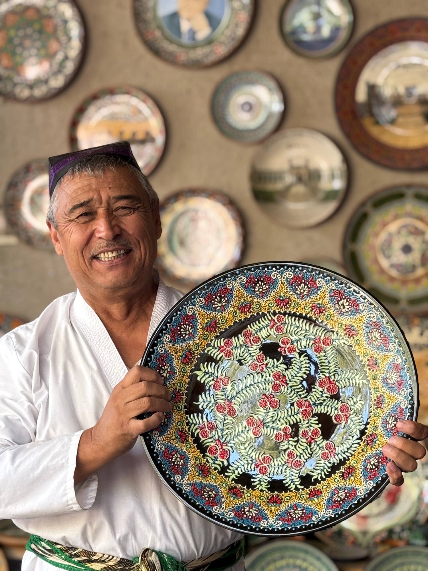 In Rishtan, we stopped at a ceramic workshop. The afternoon light was golden, dust hanging in the air. The usta—the master—was painting a plate with a brush so fine it was almost invisible. Turquoise glaze caught the sun.