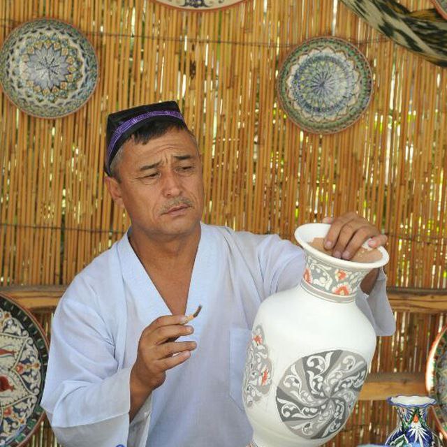 At 64, Usta Toxir Haydarov has forgotten more about ceramics than most artisans will ever learn. For over 40 years, he's perfected a technique that transforms Bukhara's opulent aesthetic into tactile art: thousands of raised dots applied by hand, building into pomegranate trees, spiraling arabesques, and eight-pointed stars.