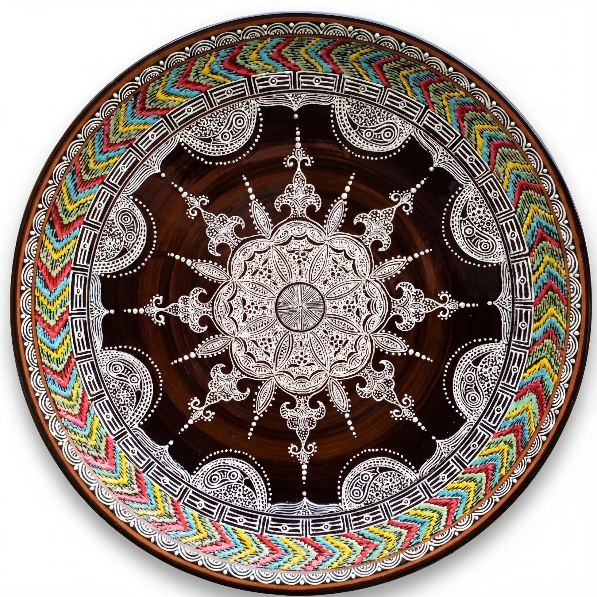 This plate inverts expectations. Where most Bukhara ceramics build color upon color, Toxir strips back to essentials here: the raw chocolate-brown of fired clay, and white slip drawn across it in lines fine as thread. The central mandala radiates eight fleur-de-lis points, each surrounded by paisley forms stippled with white dots. Between them, geometric borders and arabesque curves spiral inward to a rosette that anchors the whole.
