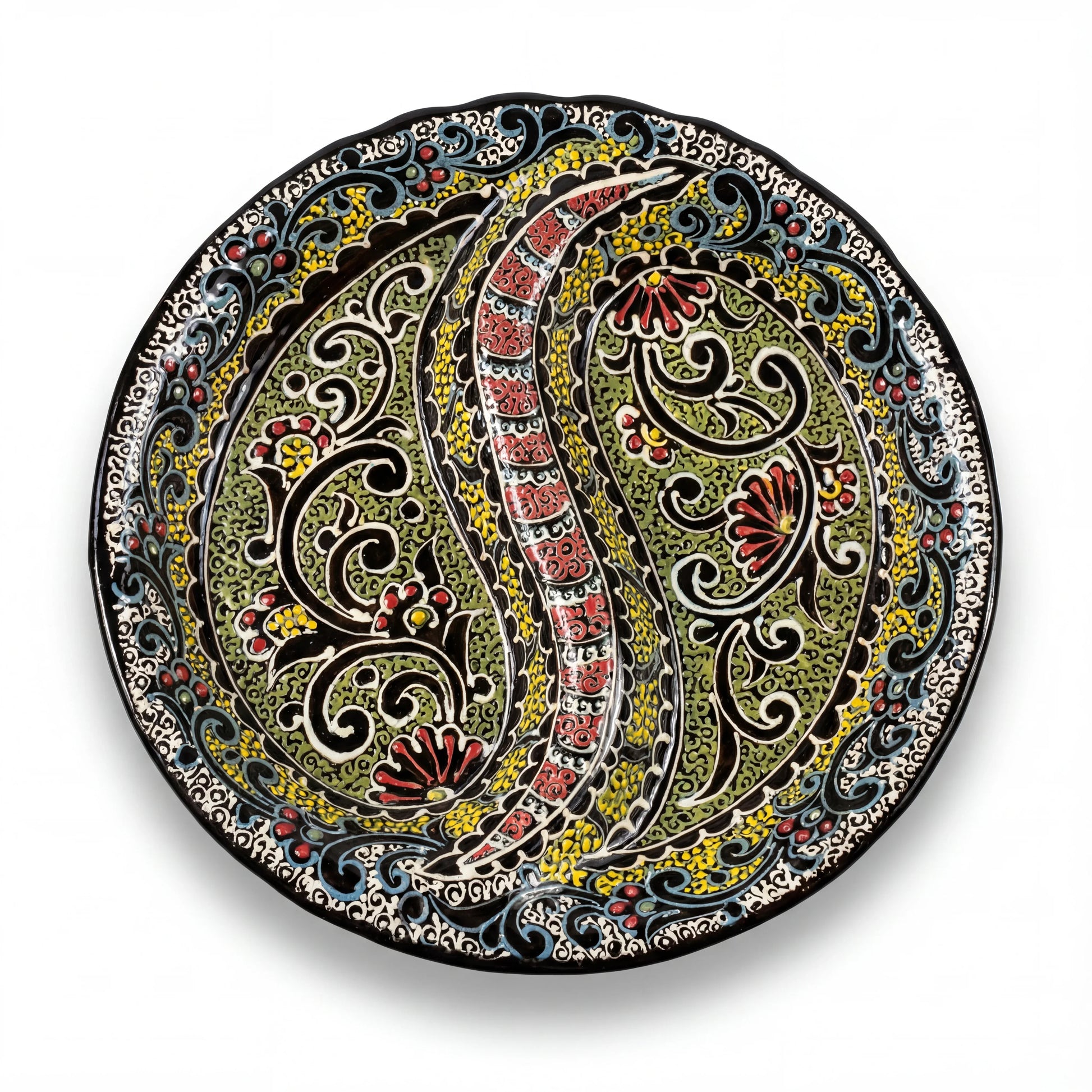 Two mirrored paisleys dominate the composition, their chartreuse bodies filled with crimson florals and navy scrollwork so dense they seem to pulse. A vertical band of geometric patterns runs between them—each diamond and dot placed by hand. The border curves with cream waves against jet black, and where those colors meet, the glaze has bled just slightly, softening the edge.