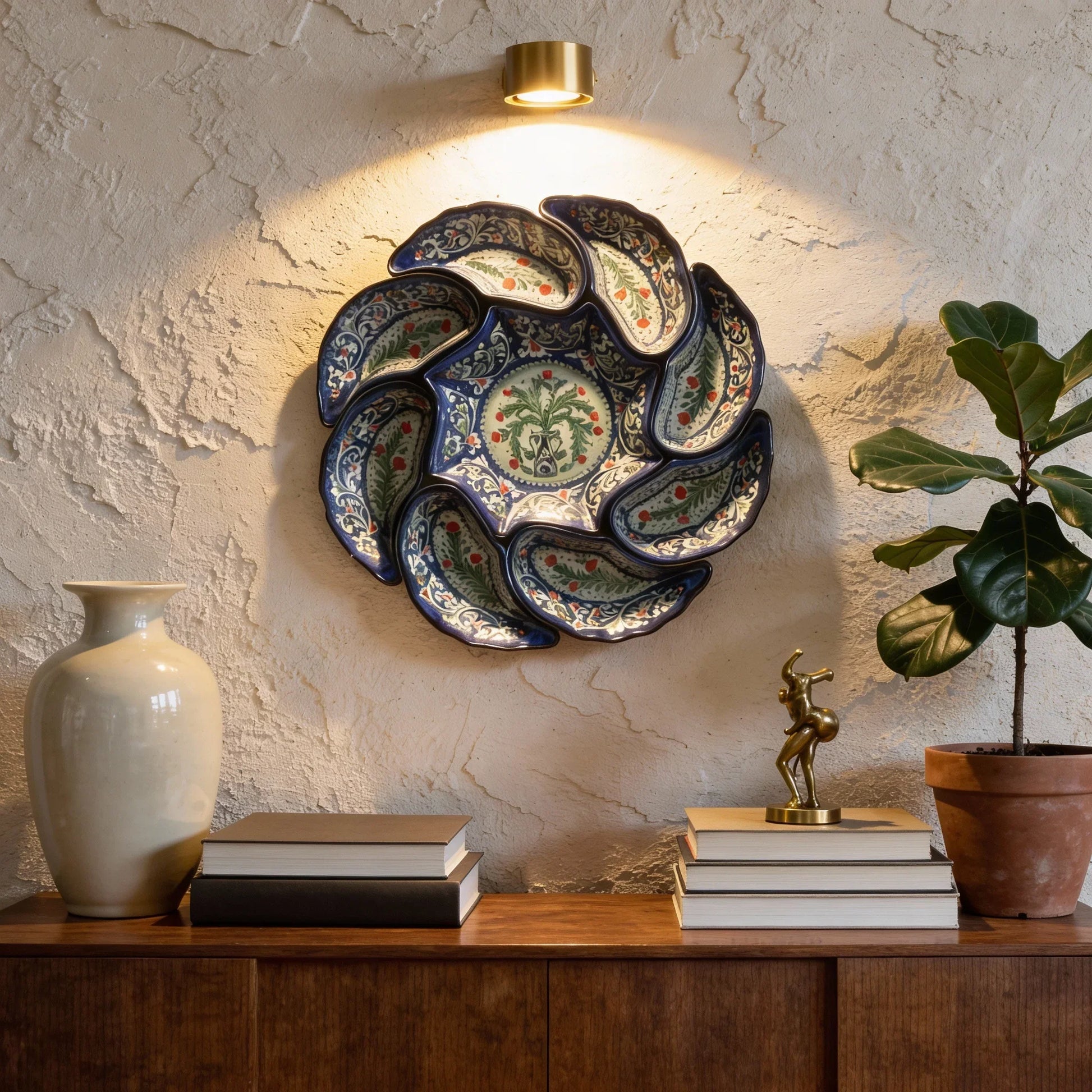 In Uzbek culture, how you welcome guests reveals who you are. The food you serve matters—but how you present it matters just as much. This is the tradition Usta Dilshodjon honors through his work. Working in Namangan, eastern Uzbekistan, Dilshodjon specializes in multi-compartment serving dishes—pieces that are both technically demanding and artistically stunning. These aren't just serving dishes; they're cultural statements. In Uzbekistan, sharing food is sacred. When guests arrive, you present them with a dastarkhan that demonstrates care, abundance, and respect. What collectors discover: these pieces are too beautiful to use only for serving. Many mount them on walls, display them year-round, let them bloom in their spaces permanently. This is functional art in its truest form—beautiful enough to display, functional enough to use.